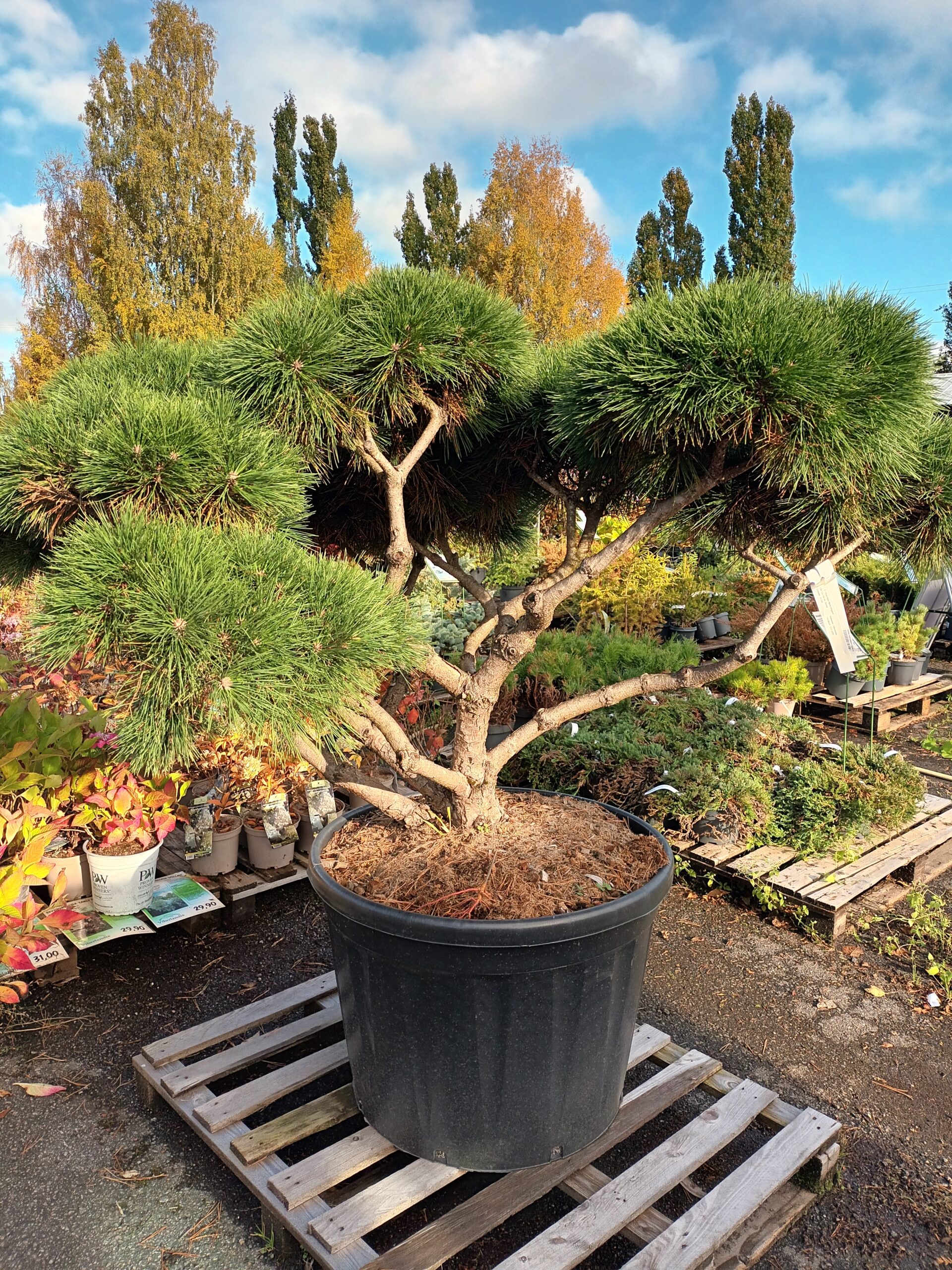 Mustamännystä muotoon leikattu bonsaimallinen, monirunkoinen puu. Todellinen taideteos puutarhaan!