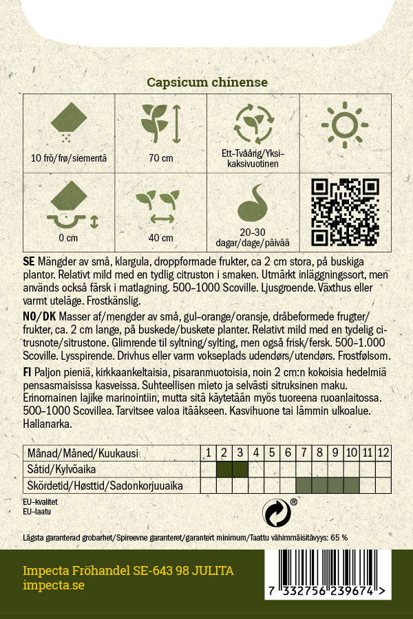 Esikasvatus sisätiloissa kylvömullassa. Valossa itävä. Kostuta multa ennen kylvöä ja paina siemenet vain kevyesti pintaan. Peittäminen läpinäkyvällä peitteellä, jossa on ilma-aukot, vaihtoehtoisesti säännöllinen tuuletus. Pidä kylvös 20-25 lämpöasteessa, itämisen jälkeen valoisassa ja hieman viileämmässä. Istutus ulos karaisun jälkeen, kun hallanvaara on ohi. Kasvatetaan lämpimissä paikassa ulkona, kasvihuoneessa tai vastaavassa.