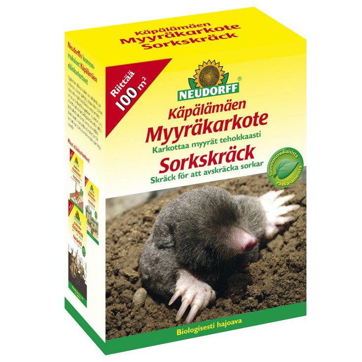 Käyttövalmis luonnonmukaisista ainesosista koostuva myrkytön sirote, joka tuoksunsa ansiosta karkottaa myyrät tehokkaasti. Ei vahingoita eläintä eikä aiheuta haittaa ympäristölle. Tehoaine laventeliöljy (0,5g/kg) sekä muut eteeriset öljyt. Hyvin riittoisa, pakkauksella käsittelee n. 100m2.