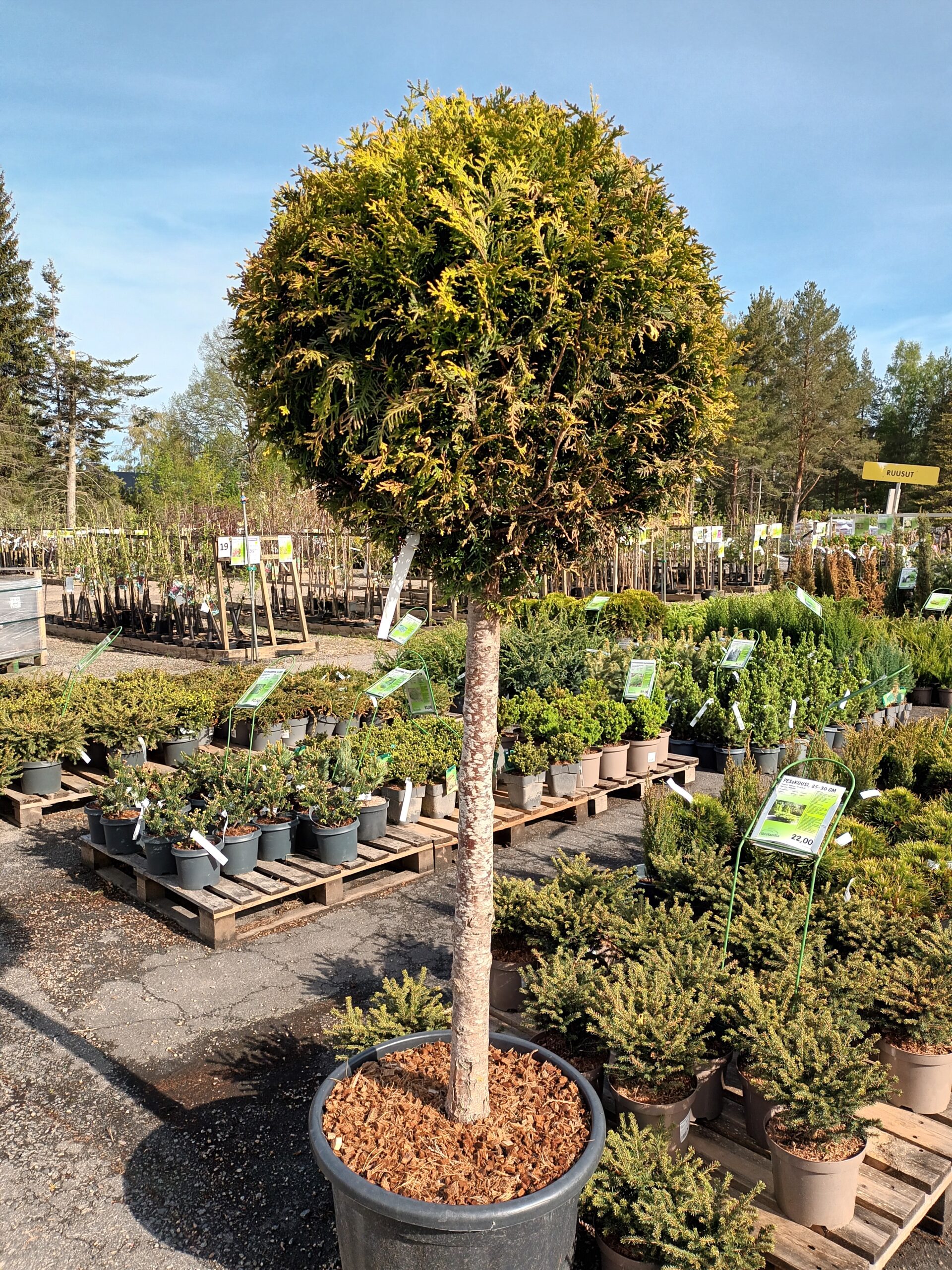 Todella näyttävä rungollinen kartiotuija, jolla on muotoon leikattu pallomainen latvus.