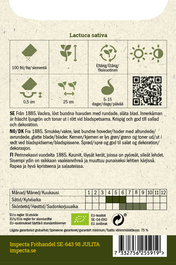 Kylvä suoraan maahan, kun maaperä on sulanut ja lämmennyt. Kastele multa ennen kylvöä ja pidä kosteana itämisen aikana. Saat tiiviit kerät, kun korjaat taimivälin harventaen 25 cm:iin. Voidaan kylvää erissä ja korjata satoa pitkin kautta lehtisalaatin tavoin.