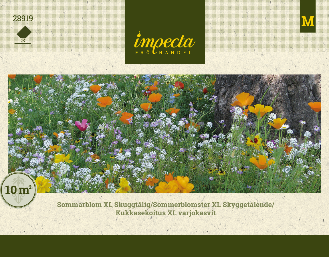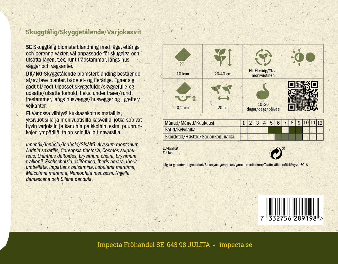 Varjossa viihtyvä kukkasekoitus matalilla, yksivuotisilla ja monivuotisilla kasveilla, jotka sopivat hyvin varjoisiin ja karuihin paikkoihin, esim. puunrunkojen ympärillä, talon seinillä ja tienvarsilla.Sisältö: Liten stenört (Alyssum montanum), kivikkokilpiruoho (Aurinia saxatilis), tiikerikaunosilmä (Coreopsis tinctoria), keltakosmoskukka (Cosmos sulphureus), ketoneilikka (Dianthus deltoides), gyllenlack (Erysimum cheirii), sommarkårel (Erysimum x allionii), kaliforniantuliunikko (Eschscholzia californica), katkerosaippo (Iberis amara), sarjasaippo (Iberis umbellata), palsami (Impatiens balsamina), tuoksupielus (Lobularia maritima), malkolmia (Malcolmia maritima), sinisievikki (Nemophila menziesii), tarhaneito (Nigella damascena) och rentokohokki (Silene pendula).
