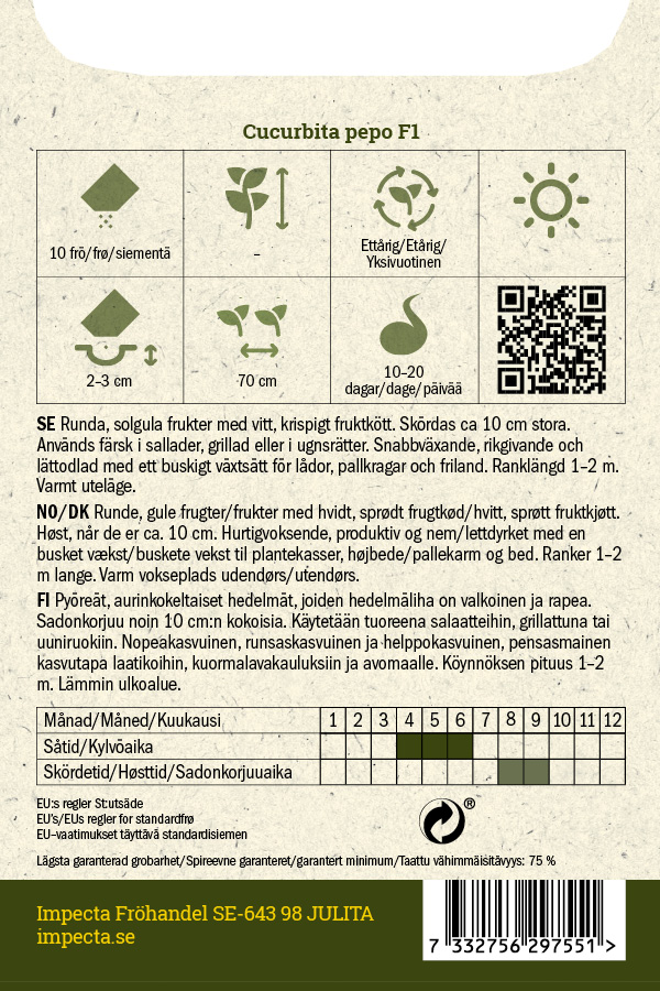 Täysin pyöreät, auringonkeltaiset hedelmät, joiden hedelmäliha on kermanvalkoinen ja rapea. Sato korjataan n. 10 cm kokoisena. Käytetään tuoreena salaateissa, grillattuna tai uuniruoissa. Nopea-, runsas- ja helppokasvuinen pensasmainen kasvi laatikoihin, lavakauluspenkkeihin ja ulkotiloihin. Verson pituus 1-2 m.