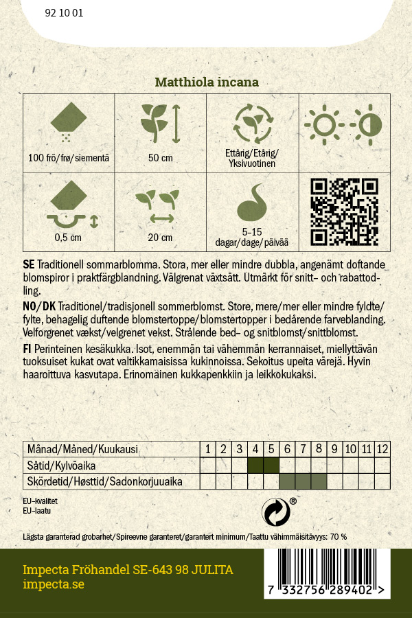 Perinteinen kesäkukka. Isot, enemmän tai vähemmän kerrannaiset, miellyttävän tuoksuiset kukat ovat valtikkamaisissa kukinnoissa. Sekoitus upeita värejä. Hyvin haaroittuva kasvutapa. Erinomainen kukkapenkkiin ja leikkokukaksi.