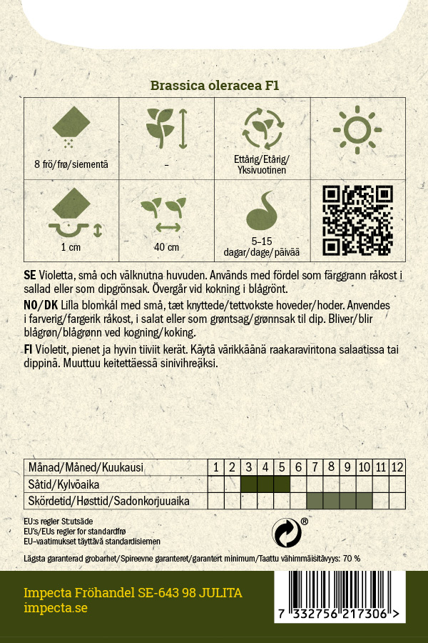 Violetit, pienet ja hyvin tiiviit kerät. Käytä värikkäänä raakaravintona salaatissa tai dippinä. Muuttuu keitettäessä sinivihreäksi.