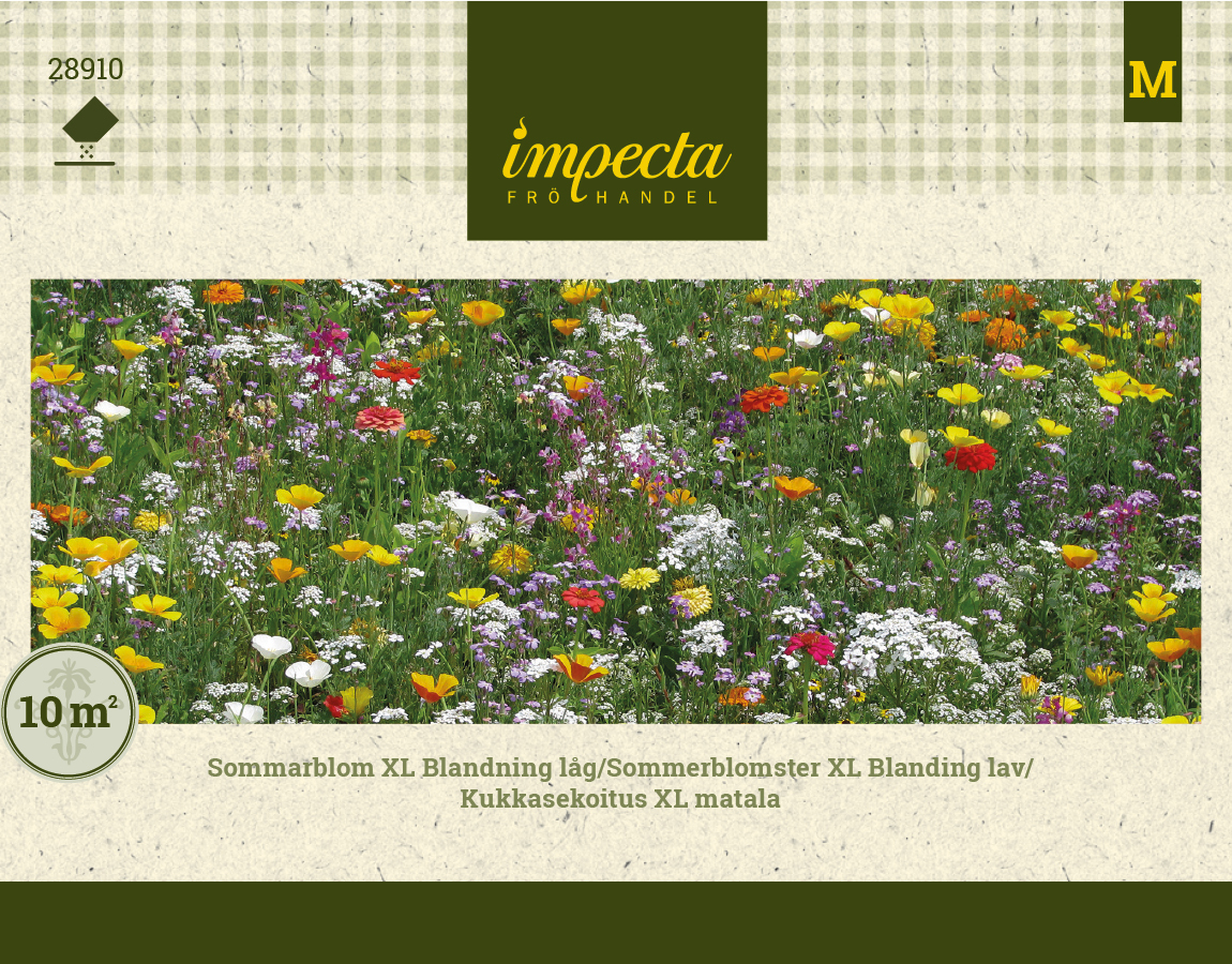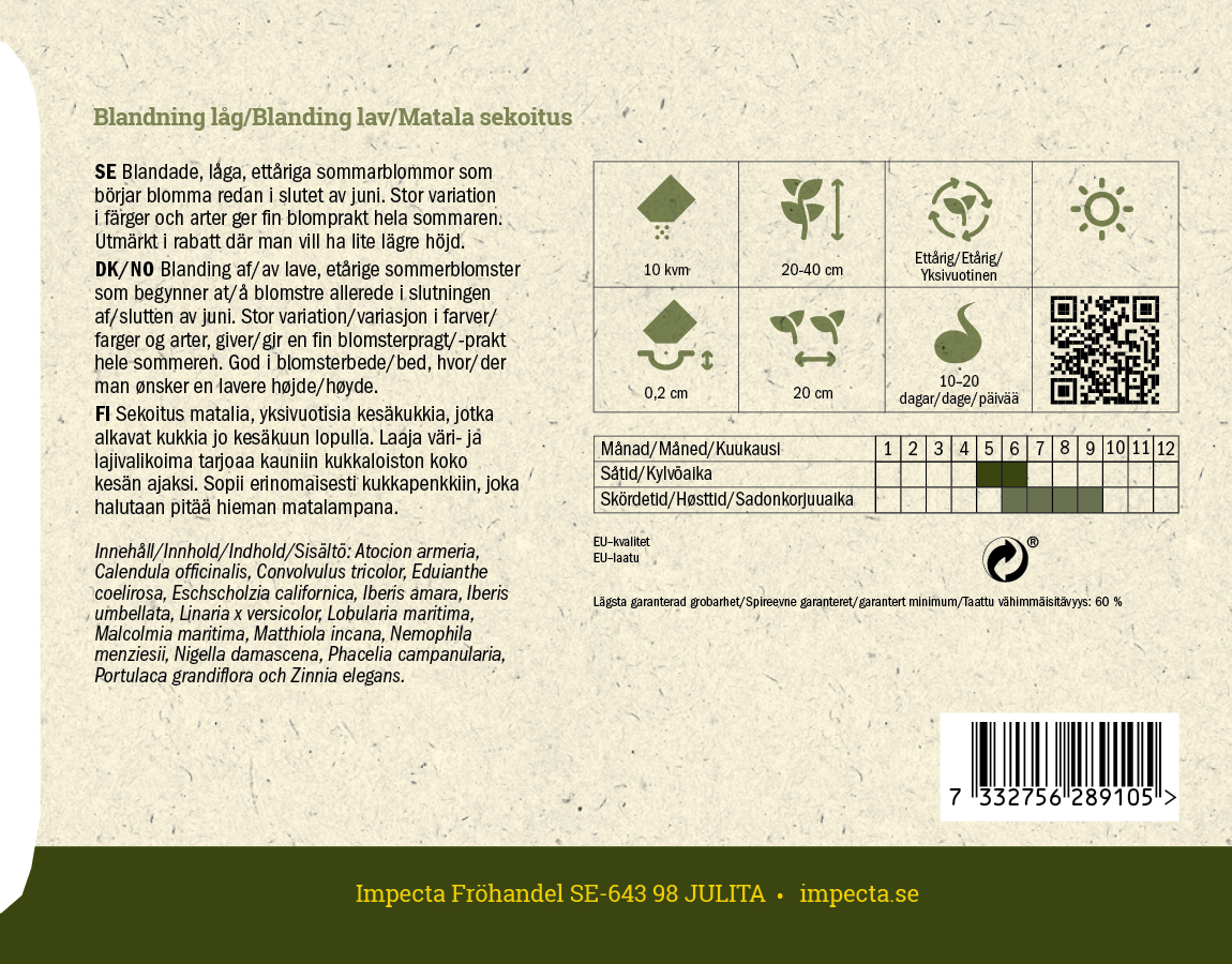 Sekoitus matalia, yksivuotisia kesäkukkia, jotka alkavat kukkia jo kesäkuun lopulla. Laaja väri- ja lajivalikoima tarjoaa kauniin kukkaloiston koko kesän ajaksi. Sopii erinomaisesti kukkapenkkiin, joka halutaan pitää hieman matalampana.Sisältö: (Atocion armeria), tarhajehäkukka (Calendula officinalis), kirjokierto (Convolvulus tricolor), (Eduianthe coeli-rosa), kaliforniantuliunikko (Eschscholzia californica), katkerosaippo (Iberis amara), sarjasaippo (Iberis umbellata), sirokannusruoho (Linaria x versicolor), tuoksupielus (Lobularia maritima), malkolmia (Malcolmia maritima), (Matthiola incana), sinisievikki (Nemophila menziesii), tarhaneito (Nigella damascena), kellohunajakukka (Phacelia campanularia), koristeportulakka (Portulaca grandiflora) ja tsinnia (Zinnia elegans).