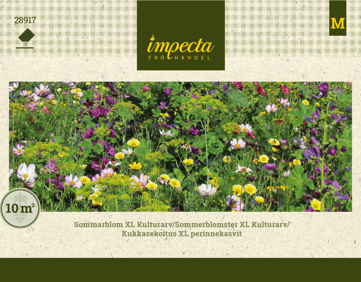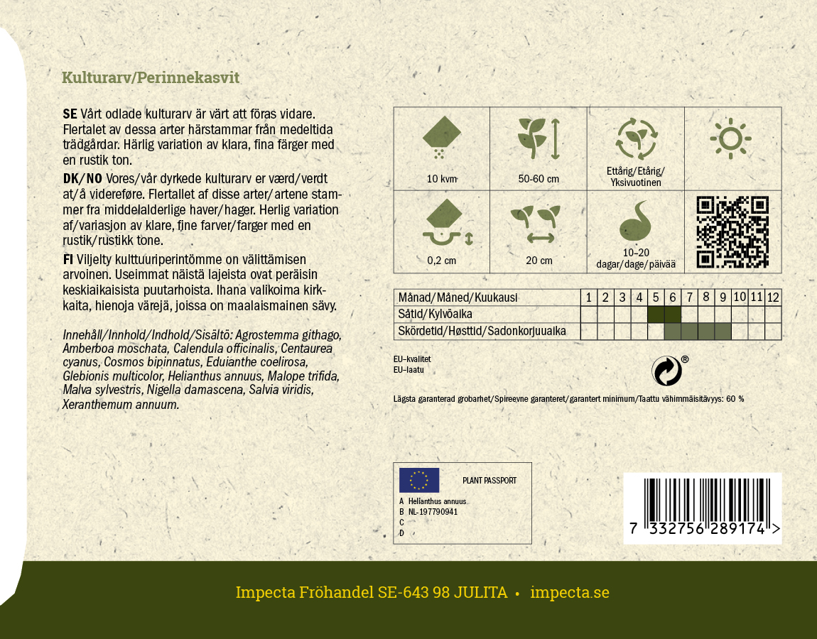 Viljelty kulttuuriperintömme on välittämisen arvoista. Suurin osa näistä lajeista ovat peräisin keskiaikaisista puutarhoista. Ihana valikoima kirkkaita, hienoja värejä rustiikkisilla sävyillä.Sisältö: Aurankukka (Agrostemma githago), tuoksukaunokki (Amberboa moschata), kehäkukka (Calendula officinalis), ruiskaunokki (Centaurea cyanus), punakosmoskukka (Cosmos bipinnatus), nejlikglim (Eduianthe coeli-rosa), brokkrage (Glebionis multicolor), isoauringonkukka (Helianthus annuus), maloppi (Malope trifida), kesämalvikki (Malva sylvestris), tarhaneito (Nigella damascena), kirjosalvia (Salvia viridis) och pappersblomster (Xeranthemum annuum).