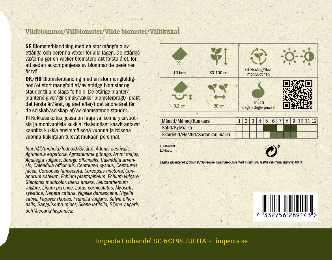Kukkasekoitus, jossa on laaja valikoima yksivuotisia ja monivuotisia kukkia. Yksivuotiset kasvit antavat kauniita kukkia ensimmäisenä vuonna ja toisena vuonna kukintaan tulevat mukaan perennat.Sisältö: Kesäruusuleinikki (Adonis aestivalis), småborre (Agrimonia eupatoria), aurankukka (Agrostemma githago), isosudenporkkana (Ammi majus), akileija (Aquilegia vulgaris), rohtopurasruoho (Borago officinalis), peltokehäkukka (Calendula arvensis), kehäkukka (Calendula officinalis), ruiskaunokki (Centaurea cyanus), rödklint (Centaurea jacea), solöga (Coreopsis lanceolata), tiikerikaunosilmä (Coreopsis tinctoria), korianteri (Coriandrum sativum), piiankieli (Echium plantagineum), blåeld (Echium vulgare), brokkrage (Glebionis multicolor), katkerosaippo (Iberis amara), päivänkakkara (Leucanthemum vulgare), sinipellava (Linum perenne), keltamaite (Lotus corniculatus), puistolemmikki (Myosotis sylvatica), aitokissanminttu (Nepeta cataria), tarhaneito (Nigella damascena), ryytineito (Nigella sativa), maissiunikko (Papaver rhoeas), brunört (Prunella vulgaris), ryytisalvia (Salvia officinalis), pikkuluppio (Sanguisorba minor), vitblära (Silene latifolia), blæresmælde (Silene vulgaris) och åkernejlika (Vaccaria hispanica).