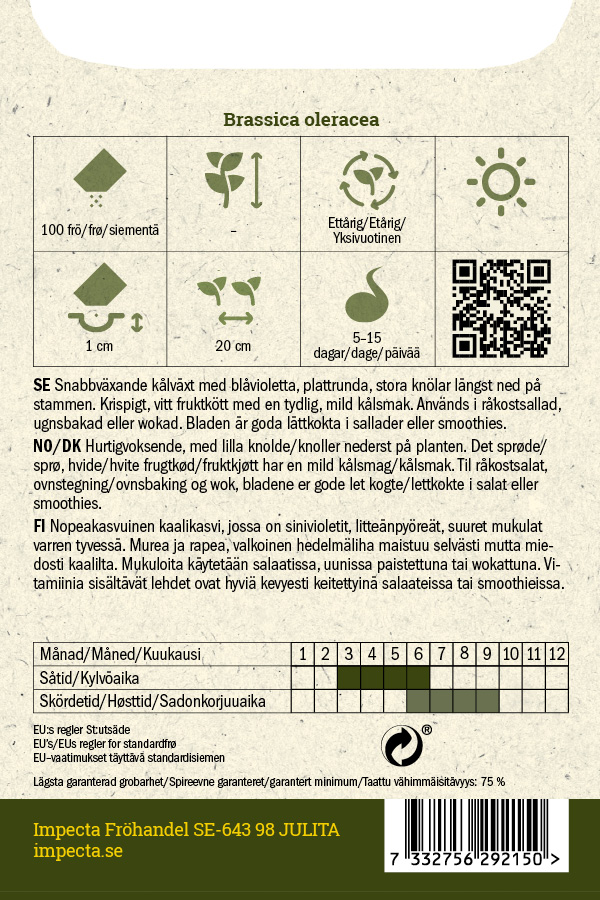 Nopeakasvuinen kaalikasvi, jossa on sinivioletit, litteänpyöreät, suuret mukulat varren tyvessä. Murea ja rapea, valkoinen hedelmäliha maistuu selvästi mutta miedosti kaalilta. Mukuloita käytetään raakaruokasalaatissa, uunissa paistettuna tai wokattuna, ja runsaasti vitamiinia sisältävät rikkaat lehdet ovat hyviä kevyesti keitettyinä salaateissa tai smoothieissa.