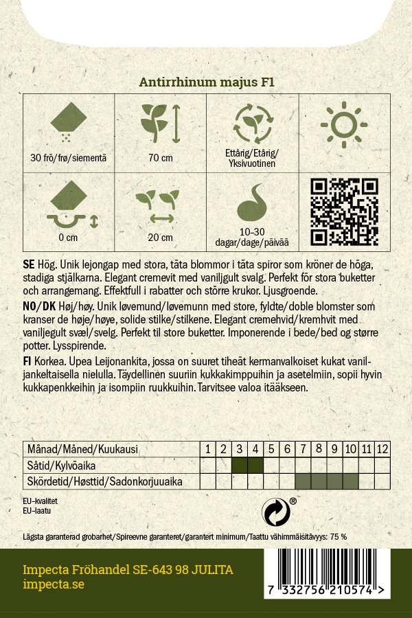 Korkea. Upea Leijonankita, jossa on suuret tiheät kermanvalkoiset kukat vaniljankeltaisella nielulla. Täydellinen suuriin kukkakimppuihin ja asetelmiin, sopii hyvin kukkapenkkeihin ja isompiin ruukkuihin.