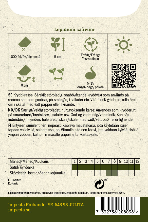 Kylvö sisätiloissa kulhossa tai vadilla olevaan multaan, kostealle paperille tai puuvillalle. Varmista, että kylvös pysyy kosteana. Krassi on valmis korjattavaksi noin viikon kuluttua. Siis erissä tarpeen mukaan.