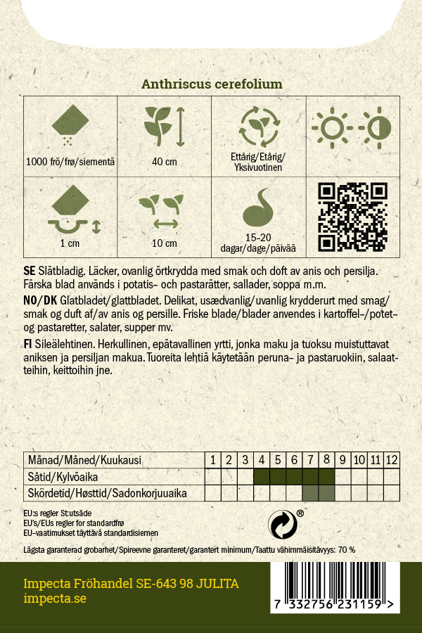 Yksivuotinen. Kylvöaika huhti-elokuu. Kylvösyvyys 1 cm