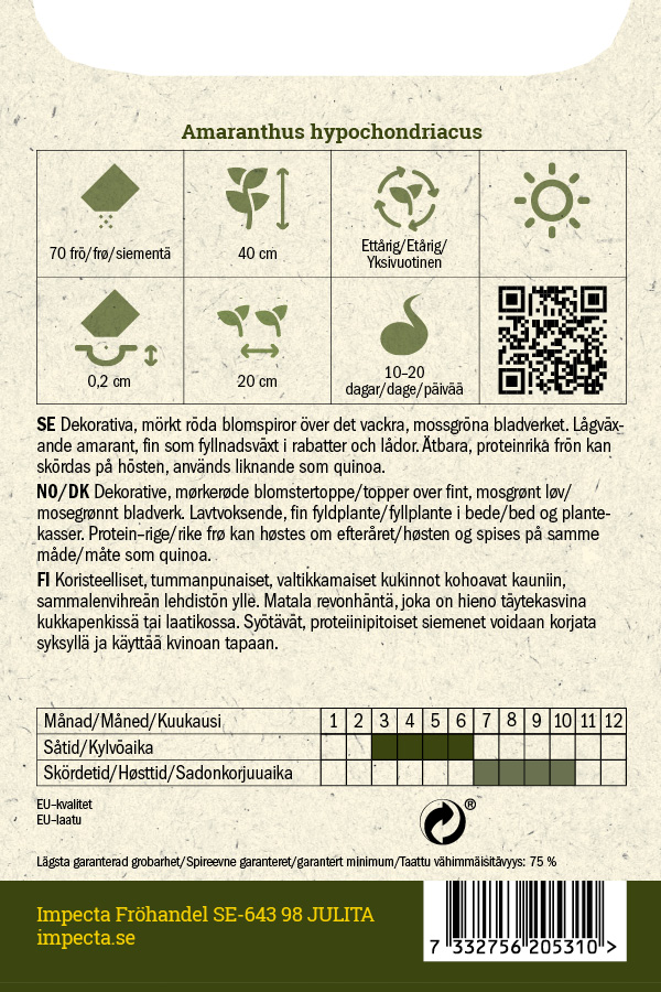 Koristeelliset, tummanpunaiset, valtikkamaiset kukinnot kohoavat kauniin, sammalenvihreän lehdistön ylle. Matala revonhäntä, joka on hieno täytekasvina kukkapenkissä tai laatikossa. Syötävät, proteiinipitoiset siemenet voidaan korjata syksyllä ja käyttää kvinoan tapaan.