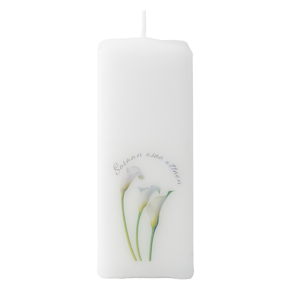 Toisinaan sanat eivät riitä. Puttipajan muistokynttilä on hiljainen ele, joka tuo lohtua ja lämpöä surun keskelle. Valkoinen kynttilä kantaa herkkää kukkakuvaa ja kauniisti kirjoitettua tekstiä: ”Suruun osaa ottaen”