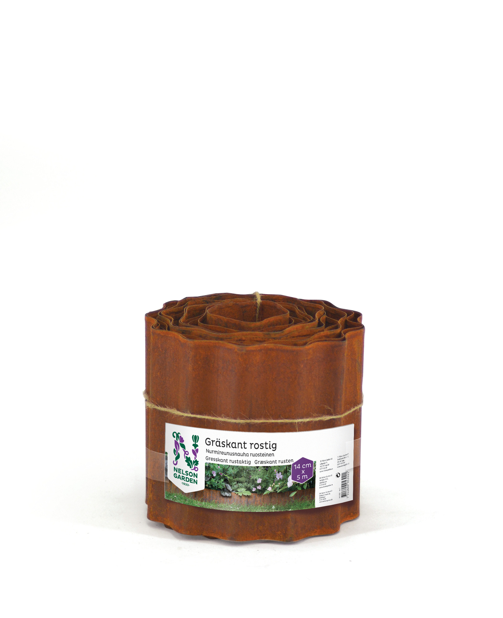 Metallinen, ruostepintaiseksi käsitelty trendikäs rajausnauha, joka asennetaan nurmikon ja suojattavan kasviryhmän väliin. Reunus estää nurmiheinän leviämisen istutusalueelle.