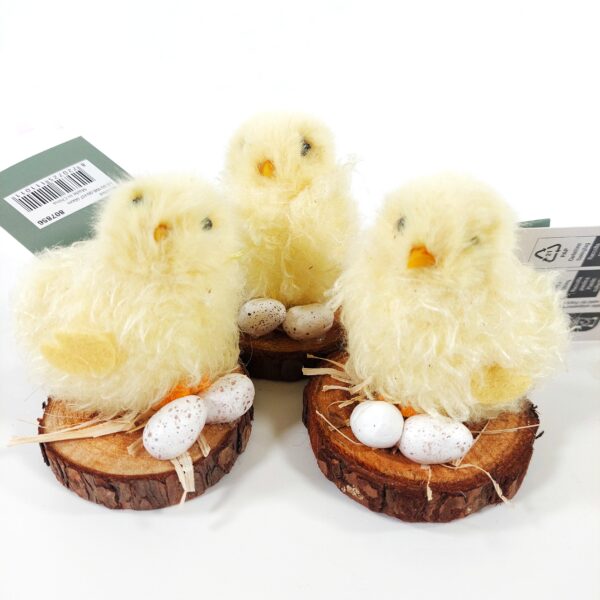 Suloinen puukiekon päällä nököttävä voinkeltainen tipunen sopii sekä ruohomättään että pääsiäispöydän pieneksi koristeeksi.