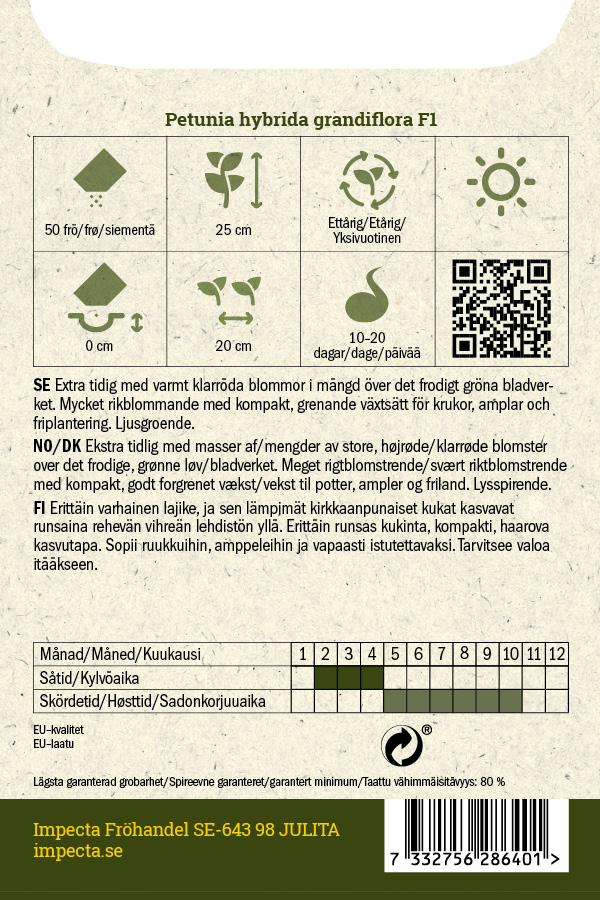 Erittäin varhainen lajike, ja sen lämpimät kirkkaanpunaiset kukat kasvavat runsaina rehevän vihreän lehdistön yllä. Erittäin runsas kukinta, kompakti, haarova kasvutapa. Sopii ruukkuihin, amppeleihin ja vapaasti istutettavaksi.