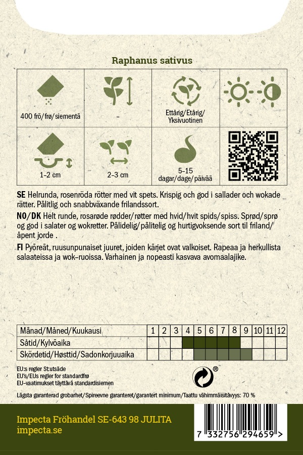 Pyöreät, ruusunpunaiset juuret, joiden kärjet ovat valkoiset. Rapeaa ja herkullista salaateissa ja wok-ruoissa. Varhainen ja nopeasti kasvava avomaalajike.