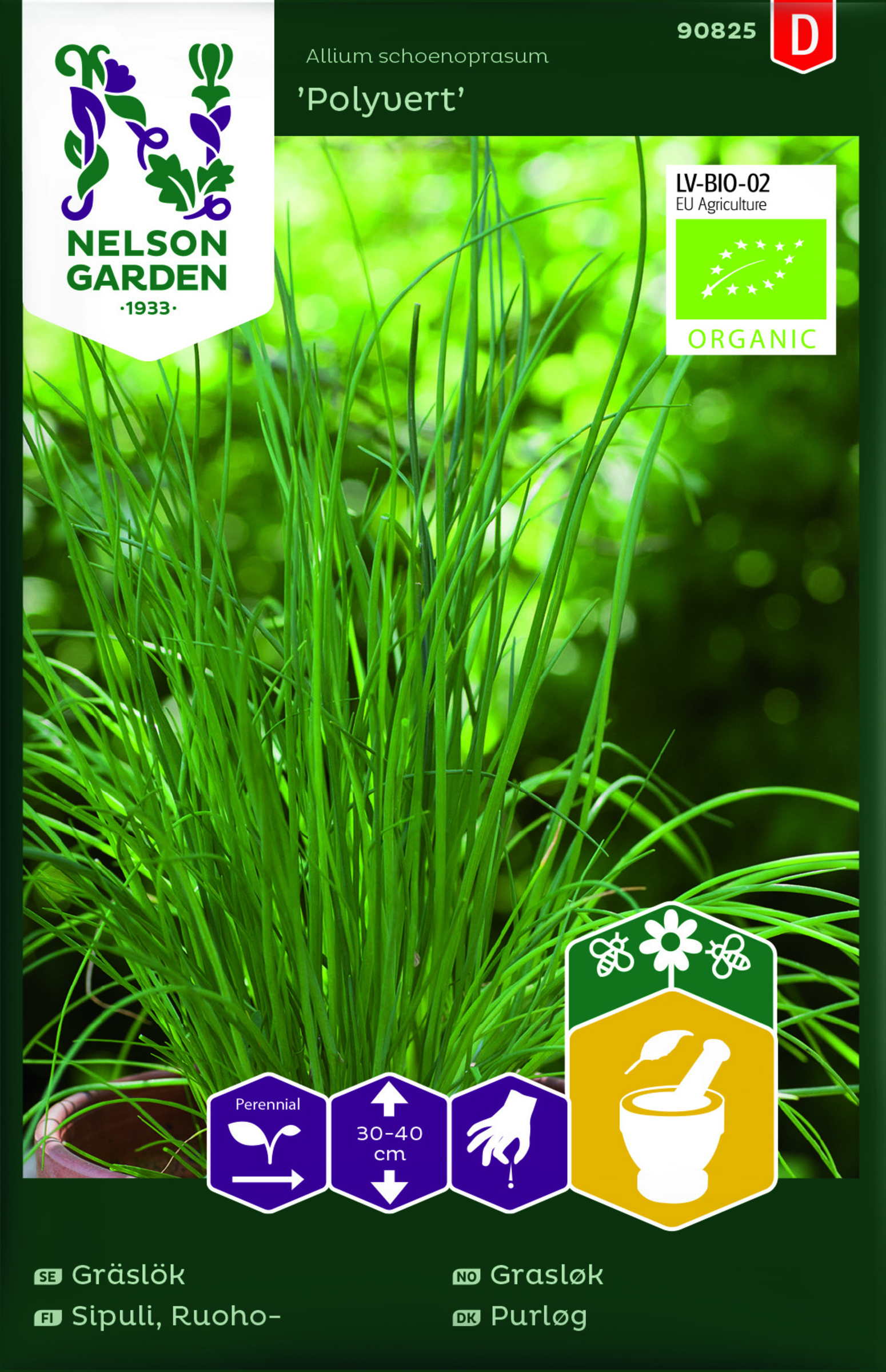 Luomulaatuinen siemen. Ruohosipulin lehdissä on hieno aromi ja mieto sipulinmaku. Kukat liilat, kauniin pyöreät. Korjaa lehtiä vähitellen ja käytä tuoreena salaattiin ja kylmiin kastikkeisiin. Myös syötävät kukat käyvät koristeeksi.