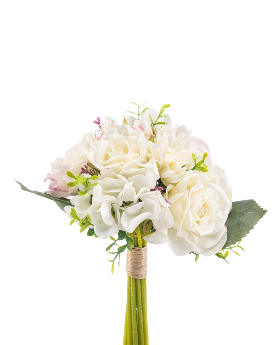 Huolella viimeistelty kimppu sisältää runsaita hortensioita ja näyttäviä ruusuja, joita täydentävät vihreät lehdet ja pienet koristeoksat. 28 cm korkuinen kimppu on helppo sijoittaa maljakkoon sellaisenaan, ja se toimii upeasti myös osana suurempaa asetelmaa.