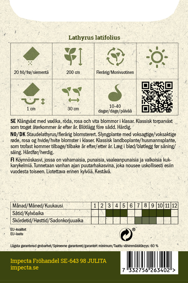 Monivuotinen. Kylvöaika maalis-toukokuu ja elo-marraskuu. Kylvösyvyys 1 cm. Liotettava ennen kylvöä