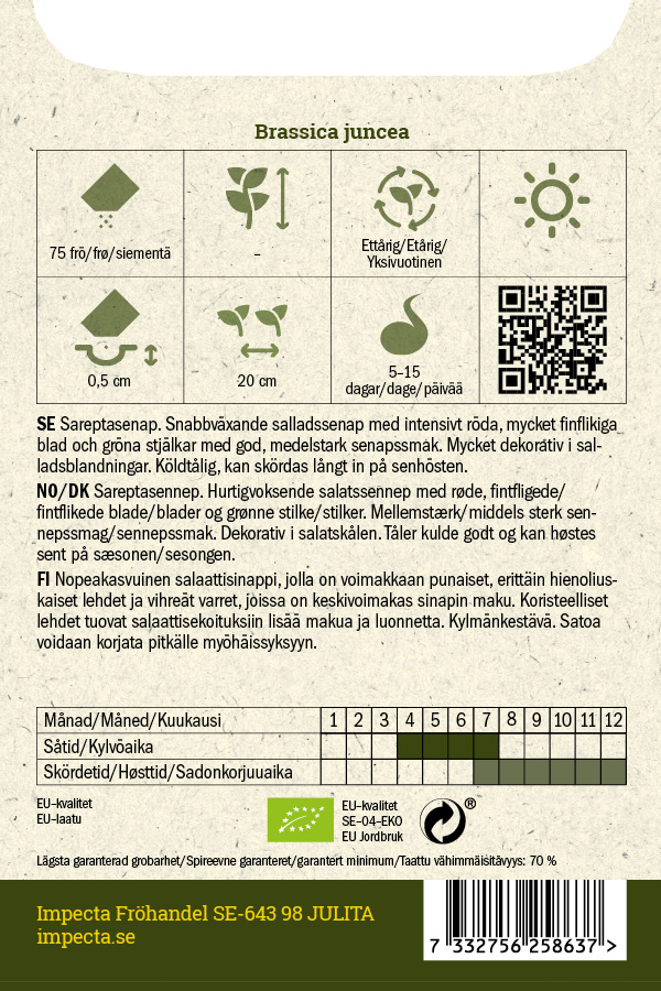Nopeakasvuinen salaattisinappi, jolla on voimakkaan punaiset, erittäin hienoliuskaiset lehdet ja vihreät varret, joissa on keskivoimakas sinapin maku. Koristeelliset lehdet tuovat salaattisekoituksiin lisää makua ja luonnetta. Kylmänkestävä. Satoa voidaan korjata pitkälle myöhäissyksyyn.