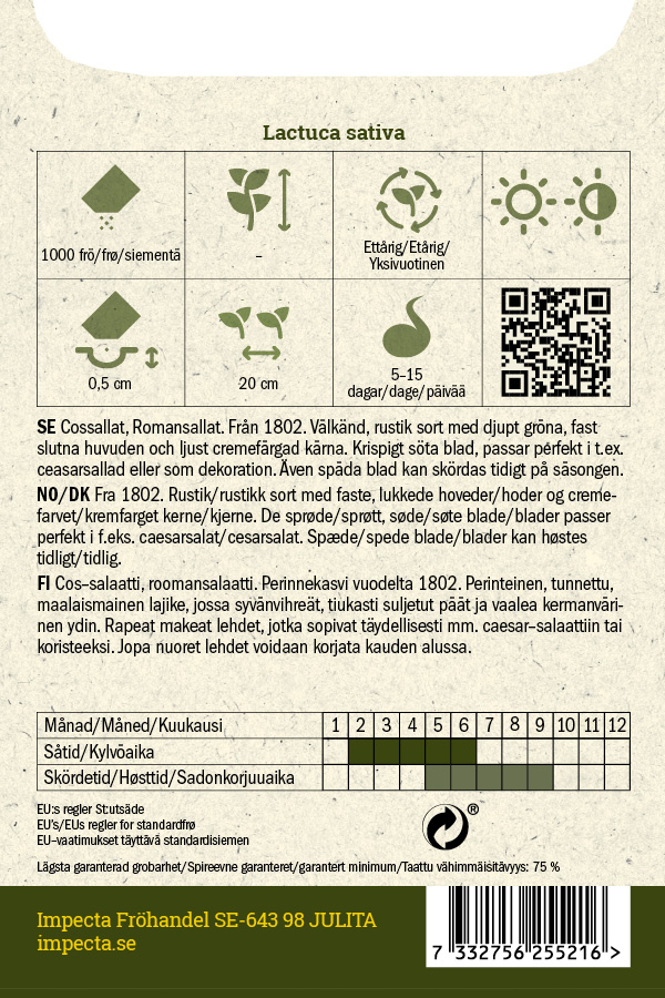 Cos-salaatti, roomansalaatti. Kulttuuriperinnekasvi vuodelta 1802. Perinteinen, tunnettu, maalaismainen lajike, jossa syvänvihreät, tiukasti suljetut päät ja vaalea kermanvärinen ydin. Rapeat makeat lehdet, jotka sopivat täydellisesti mm. caesar-salaattiin tai koristeeksi. Jopa nuoret lehdet voidaan korjata kauden alussa.
