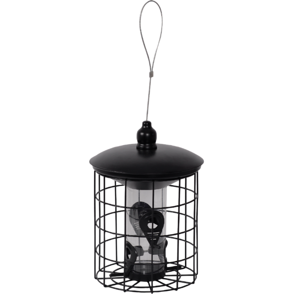 Tyylikäs ja tilava siemenautomaatti, jonka suojaristikko pitää suuret linnut poissa mutta laskee nälkäiset pikkulinnut peremmälle. Täytetään helposti yläosassa olevan ison kannen kautta. Mukana kestävä ripustusvaijeri ja karbiinihaka. Mustaa metallia.
