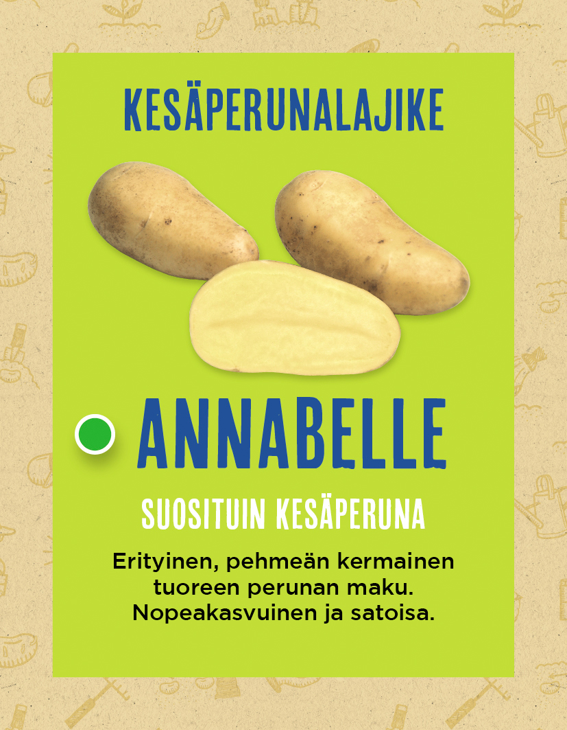 Uutuus!1 kilon pussi vaikkapa laatikkoviljelyyn!Annabelle on yksi viime vuosien suosituimmista uusista perunalajikkeista Suomessa. Suosio perustuu ennen kaikkea sen erityiseen, kermaisen pehmeään perunan makuun.Annabelle on aikainen,runsasmukulainen ja satoisa kesäperuna.