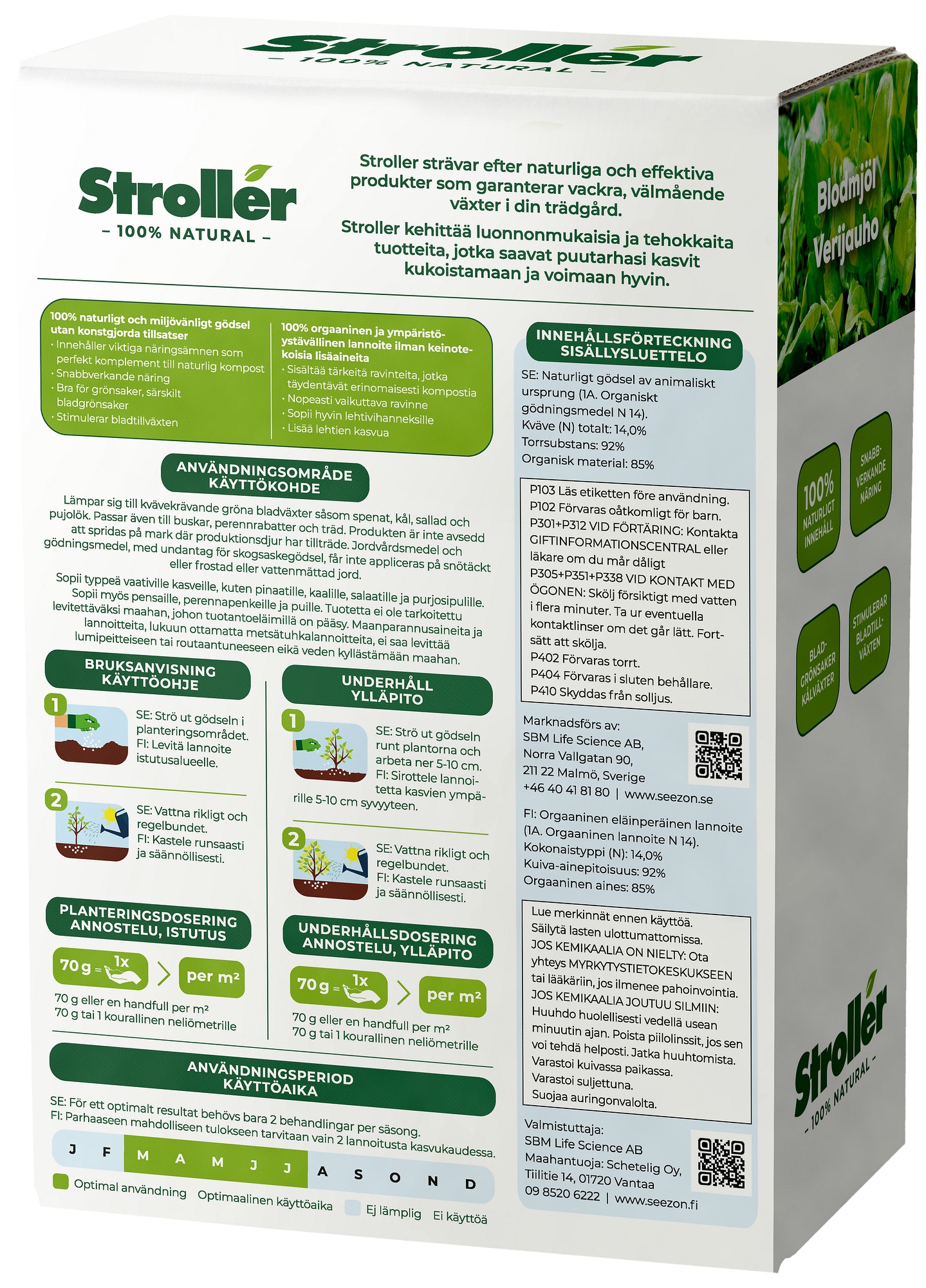 Käyttö: Verijauhoa sirotellaan kasvien ympärille istutuksen yhteydessä ja sehn jälkeen yhden kerran kasvukauden aikana. Vanhoille istutuksille kaksi kertaa kauden aikana (1.kerran huhti-toukokuussa, 2.kerta kesä-heinäkuussa), käyttömäärä 70g/m2 ( = 1 kourallinen/m2).