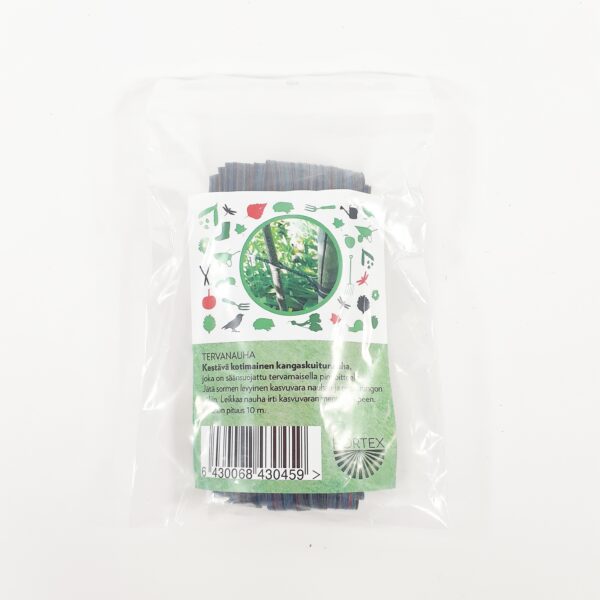 Perinteinen ja kestävä tummanruskea kangaskuitunauha puutarhakäyttöön. Suojattu säänkestävällä tervapinnoitteella, kestää hyvin vähintään kaksi kasvukautta eli akuuteimman tuentatarpeen.