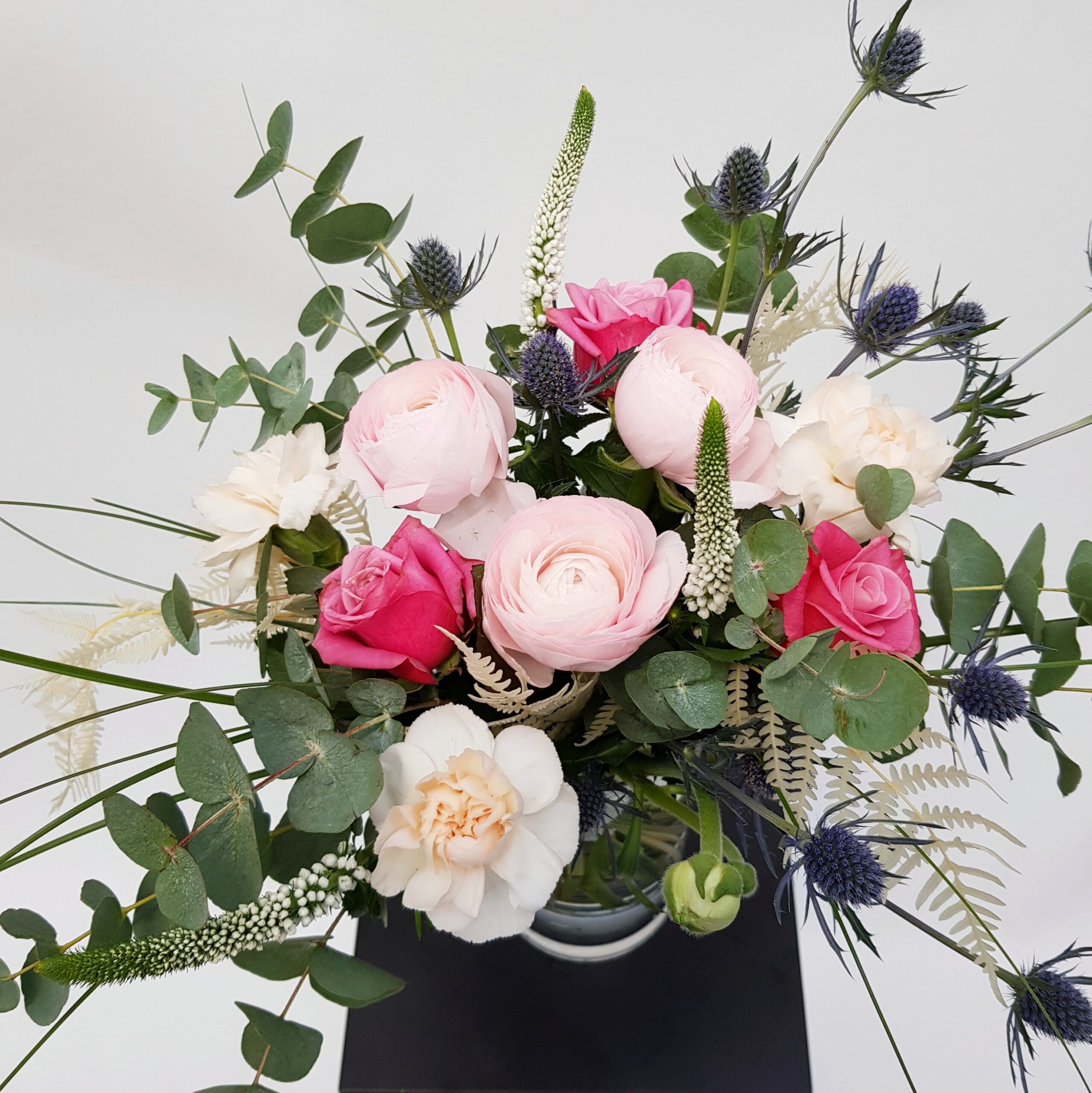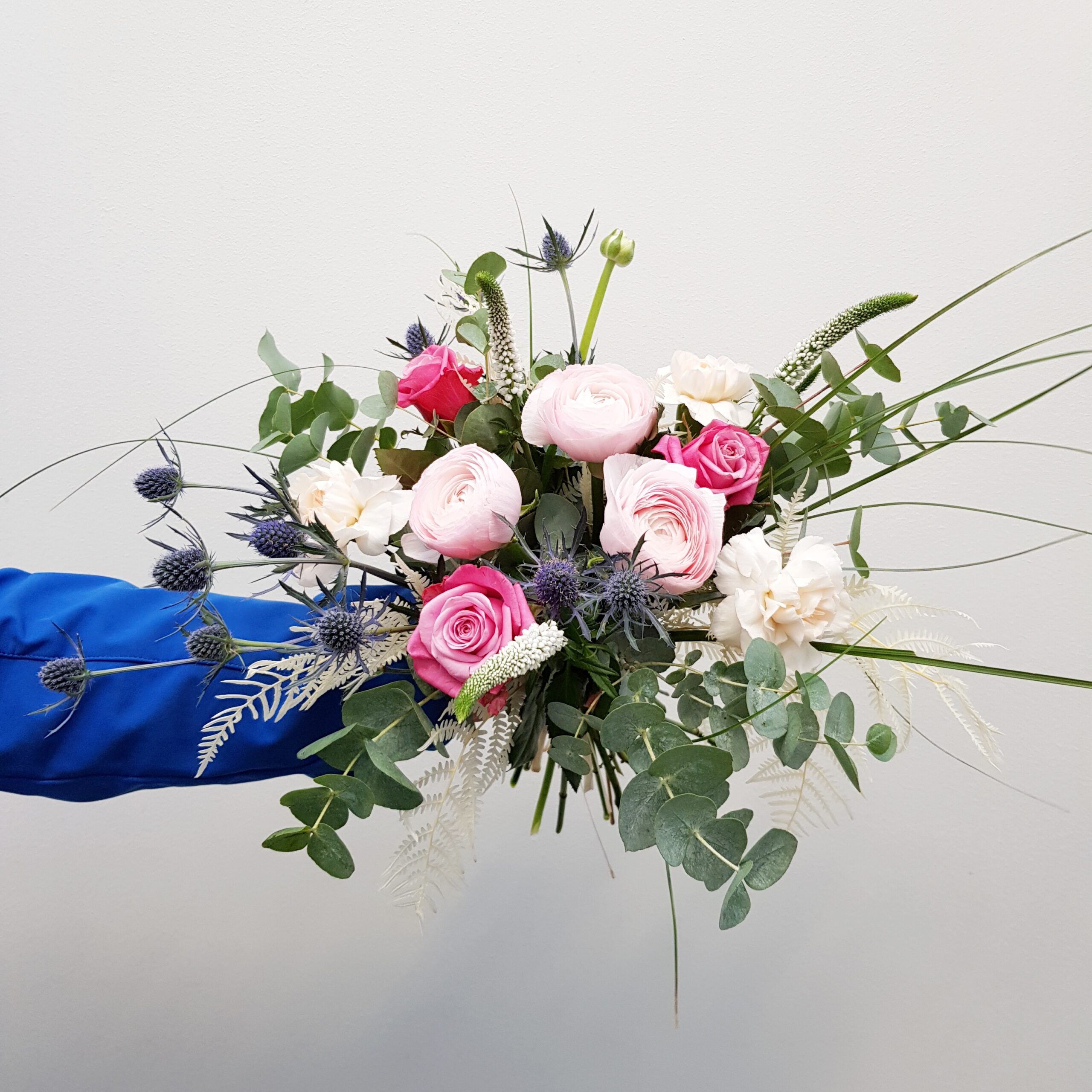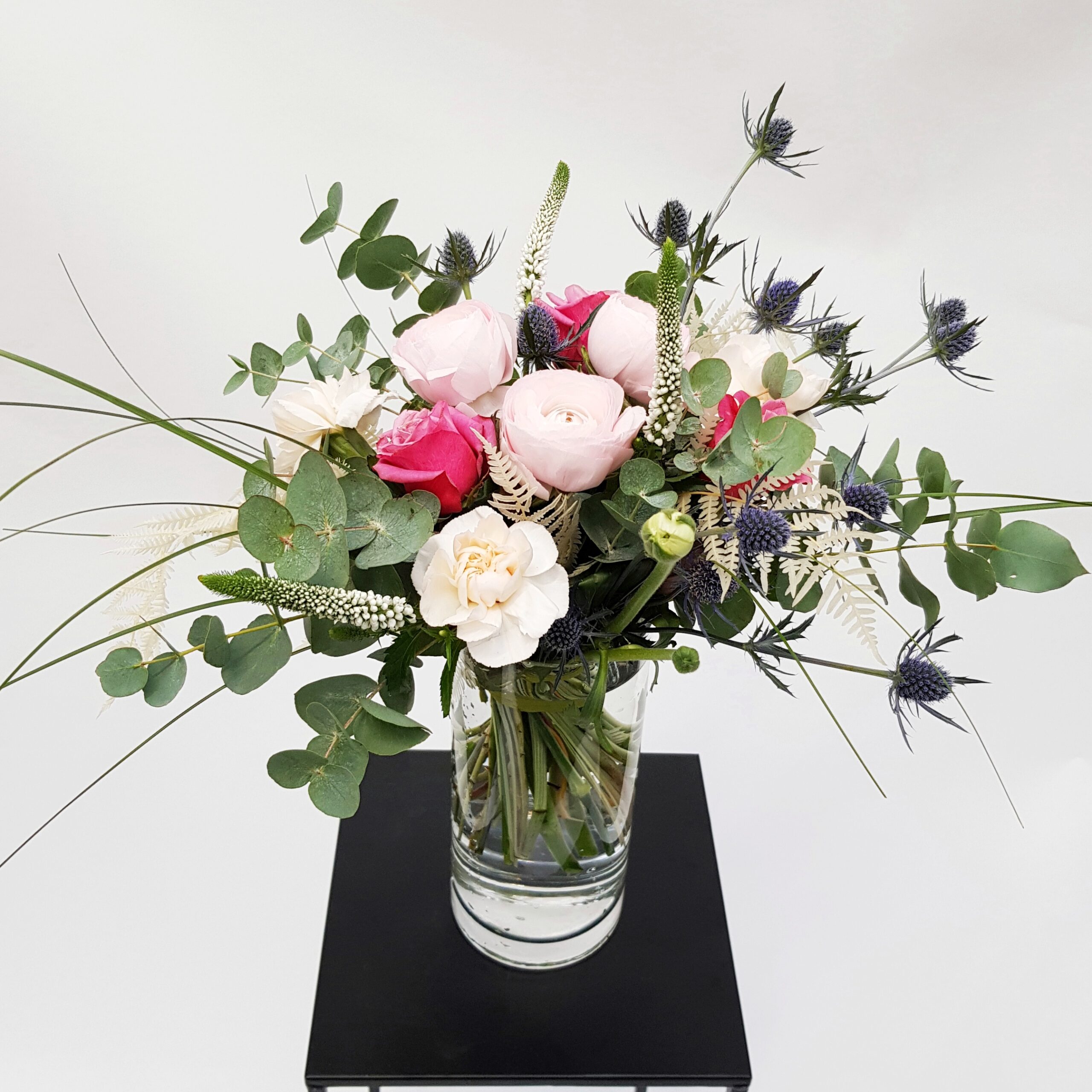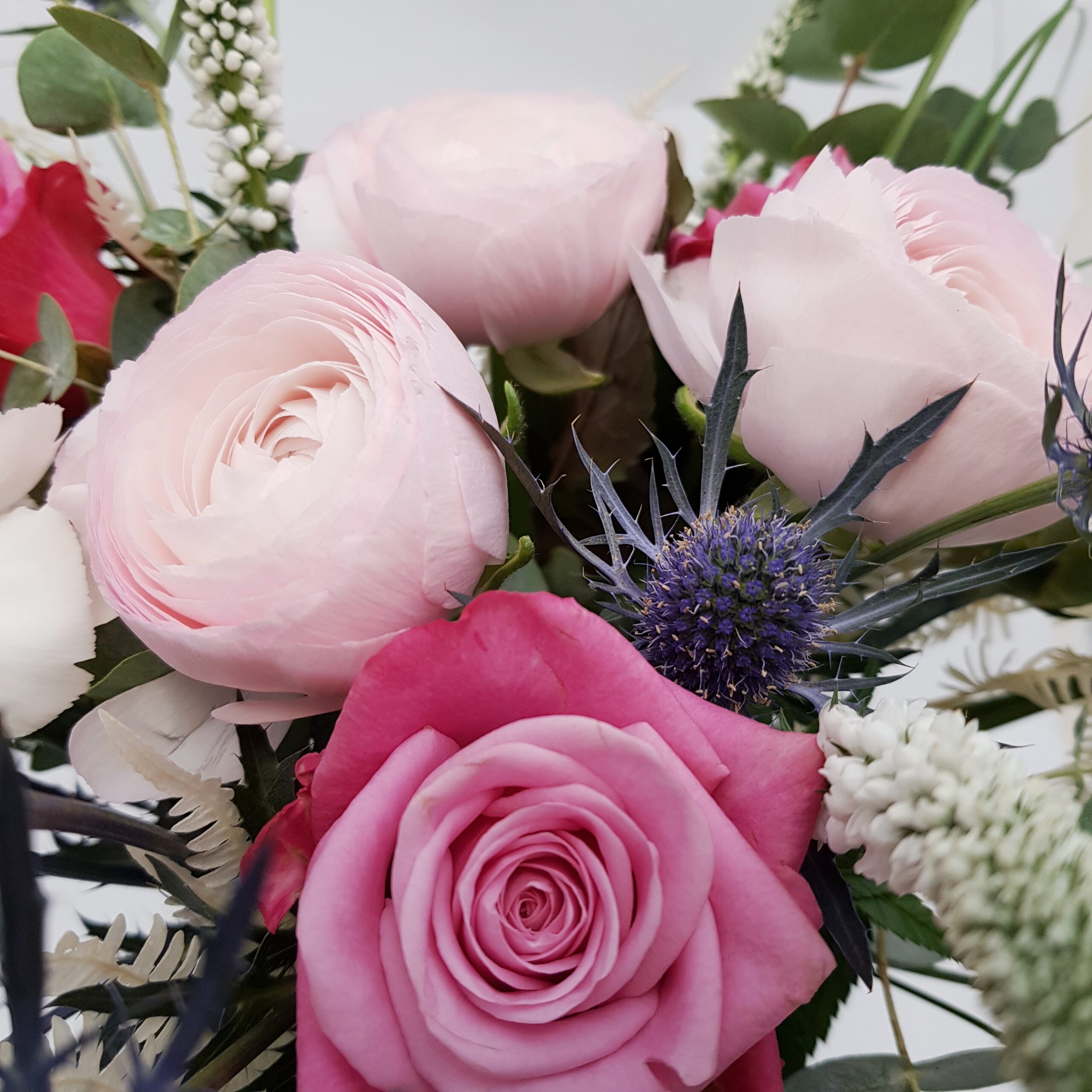 Ystävälle, kollegalle, itselle, naapurille tai kenelle vaan! Kukapa ei tästä Viherlandiassa sidotusta kimpusta ilahtuisi? Pirteän väriset ruusut, persikkaiset neilikat, hauskannäköiset piikkiputket, valkoiset tädykkeet ja valloittavan ihanat leinikit on sidottu piristävän keväiseksi kokonaisuudeksi. Rennon rönsyilevään kimppuun upeiden kukkien lisäksi on valittu ikisuosikki eucalyptus, karhunheinä ja valkaistu saniainen.