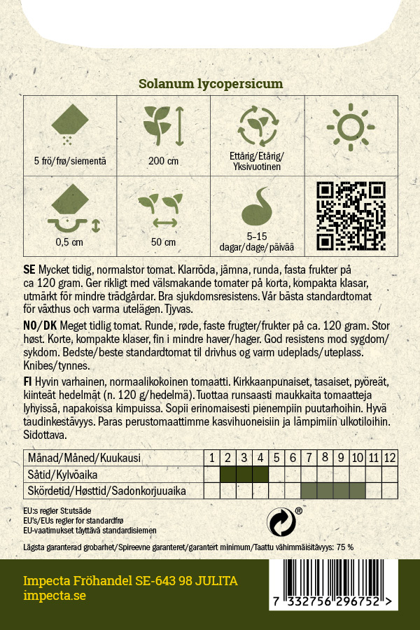 Hyvin varhainen, normaalikokoinen tomaatti. Kirkkaanpunaiset, tasaiset, pyöreät, kiinteät hedelmät (n. 120 g/hedelmä). Tuottaa runsaasti maukkaita tomaatteja lyhyissä, napakoissa kimpuissa. Sopii erinomaisesti pienempiin puutarhoihin. Hyvä taudinkestävyys. Paras perustomaattimme kasvihuoneisiin ja lämpimiin ulkotiloihin. Sidottava.