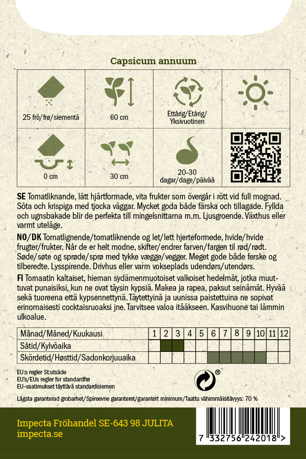 Tomaatin kaltaiset, hieman sydämenmuotoiset valkoiset hedelmät, jotka muuttuvat punaisiksi, kun ne ovat täysin kypsiä. Makea ja rapea, paksut seinämät. Hyvää sekä tuoreena että kypsennettynä. Täytettyinä ja uunissa paistettuina ne sopivat erinomaisesti cocktaisruoaksi jne.