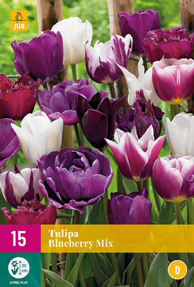 Viehättävä sekoitus sini- ja lilansävyisiä sekä valkoisia tulppaaneja, jotka kukkivat samaan aikaan.
