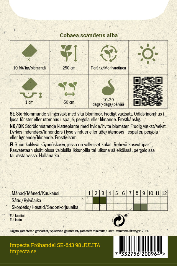 Suuri kukkiva köynnöskasvi, jossa on valkoiset kukat. Rehevä kasvutapa. Kasvatetaan sisätiloissa valoisilla ikkunoilla tai ulkona säleiköissä, pergoloissa tai vastaavissa.