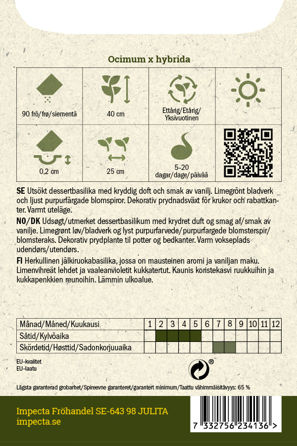 Herkullinen jälkiruokabasilika, mausteinen tuoksu ja vaniljan maku. Limenvihreät lehdet ja vaaleanvioletit kukkatertut. Kaunis koristekasvi ruukkuihin ja kukkareunoihin.