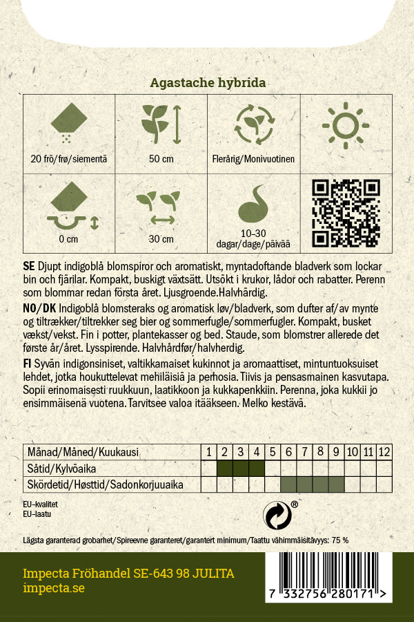 Syvän indigonsiniset, valtikkamaiset kukinnot ja aromaattiset, mintuntuoksuiset lehdet, jotka houkuttelevat mehiläisiä ja perhosia. Tiivis ja pensasmainen kasvutapa. Sopii erinomaisesti ruukkuun, laatikkoon ja kukkapenkkiin. Perenna, joka kukkii jo ensimmäisenä vuotena. Fleuroselect-kultamitalisti vuodelta 2012.